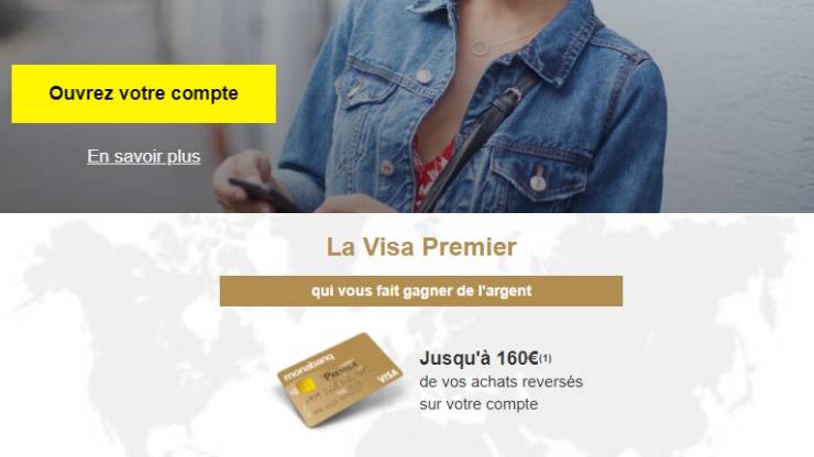 Avec Monabanq, vos dépenses par carte bancaire vous rapportent de l'argent ! Pour toute nouvelle ouverture d'un compte courant avec Visa Premier dans la banque en ligne, une prime de bienvenue pouvant aller jusqu'à 160 euros vous est ainsi offerte.